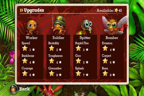 《蟻丘保衛(wèi)戰(zhàn)Anthill》(又名“蟻丘塔防”)游戲的概念清晰,規(guī)則很簡(jiǎn)單,上手很快,玩家需利用各種武器和工具保衛(wèi)自己的蟻穴,同時(shí)搜集資源,資源是指敵人的尸體(作為養(yǎng)料,可別誤會(huì)是有什么變態(tài)的喜好)。工蟻收集資源,兵蟻負(fù)責(zé)保衛(wèi)工蟻的安全。另外還有專門負(fù)責(zé)轟炸和打洞的蟻種。控制螞蟻的路線只要在屏幕上畫出其他路線,螞蟻就會(huì)改變方向,雙擊可以擦去原來路線,路線的形狀可以隨你喜好,非常有趣!