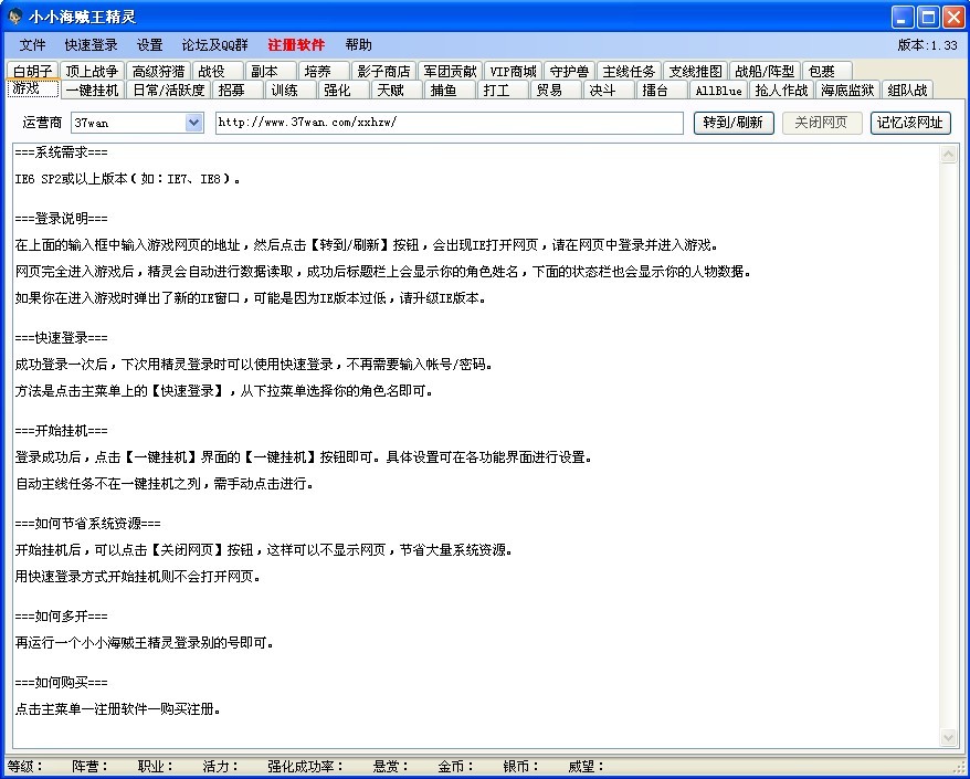 小小海賊王精靈是專門為游戲《小小海賊王》精心制作的游戲輔助。他功能強(qiáng)大,使用方便。只需雙擊打開運(yùn)行,就可以自動(dòng)幫您打怪、刷裝備、做副本。是您政府海賊王的最佳工具。