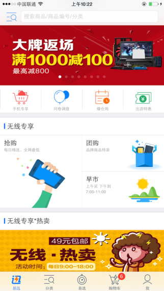1.限時(shí)搶購(gòu),易迅團(tuán)購(gòu),早市/天黑黑/周末清倉(cāng),hold住全場(chǎng)的給力低價(jià)!2.時(shí)尚新品,蘋果專區(qū),小易推薦,讓你天天新視覺(jué)!