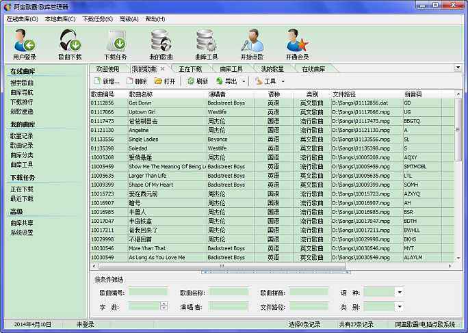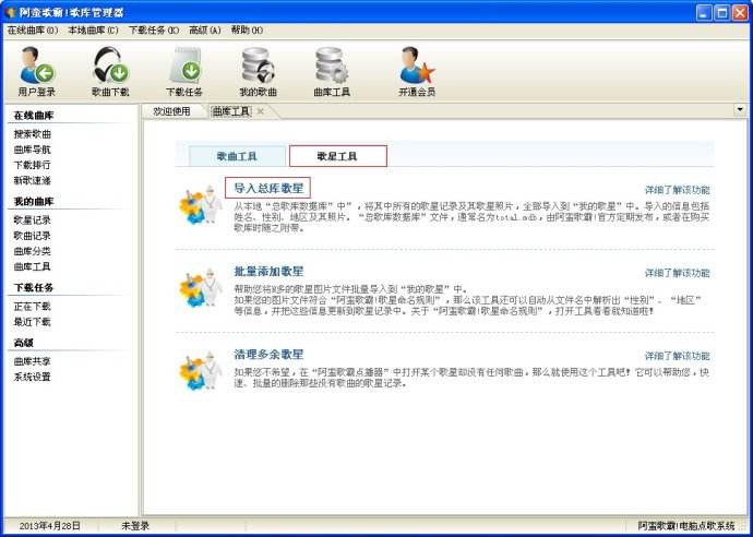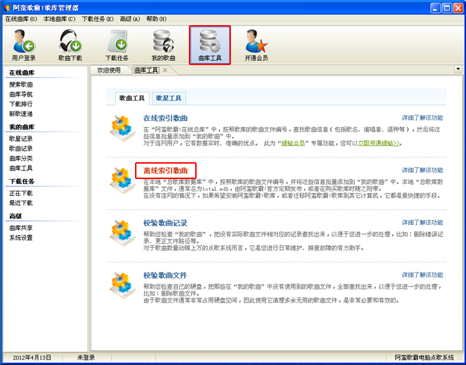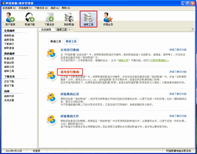 一、批量導(dǎo)入歌曲的方法1、打開“歌庫管理器”,曲庫工具 → 歌曲工具;運行“離線索引”或者“在線索引”工具。