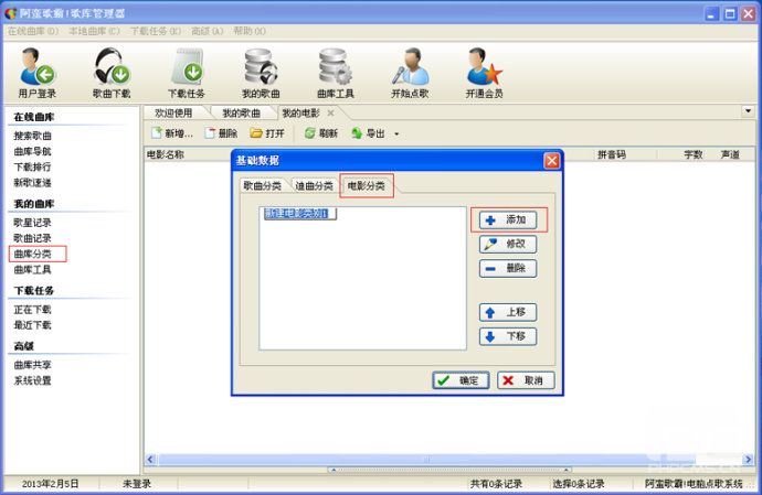 在“曲庫分類”對話框,點擊“電影分類”→“添加”→輸入“分類名稱”→“確定”。