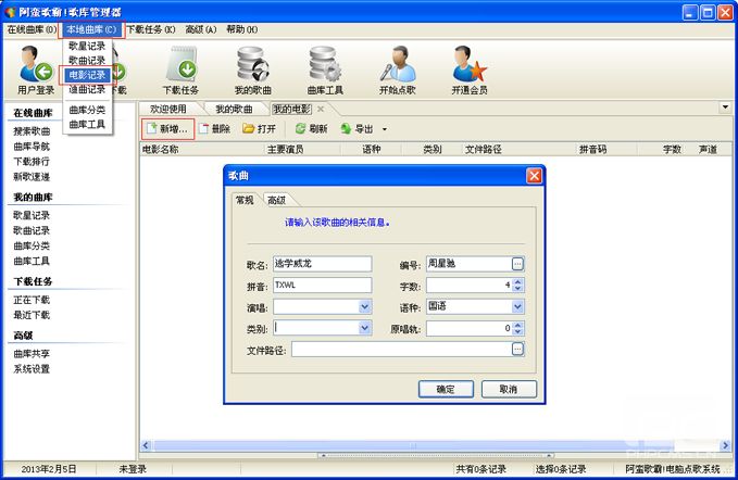 在“電影記錄”子窗口,點擊“新增”;輸入電影信息及其電影分類。
