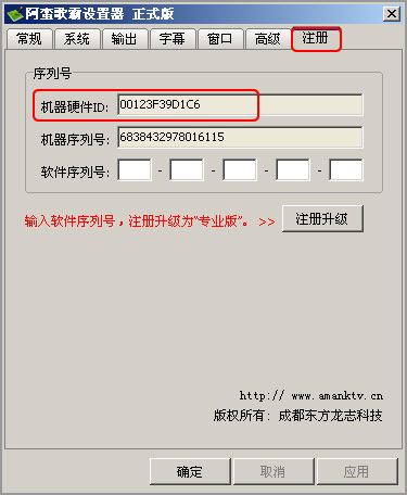 首先,把您的機器硬件ID告訴我們的客服人員。打開“阿蠻歌霸設(shè)置器”,在“注冊”頁面,就可以看到您機器的硬件ID。注意,硬件ID是唯一的,不同的計算機擁有各自不同的硬件ID。系統(tǒng)重裝后,硬件ID仍然保持不變。