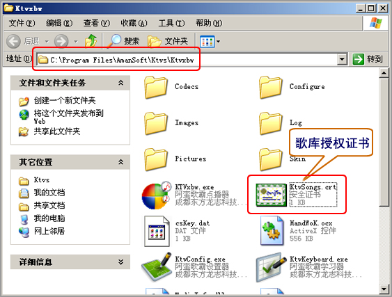 您取得“歌庫授權(quán)證書”后,將該文件存放到“阿蠻歌霸點播器”應(yīng)用程序所在的文件夾,并注意“歌庫授權(quán)證書”文件應(yīng)命名為:KtvSongs.crt。比如,您的“阿蠻歌霸點播器”安裝在“c:\program files\amansoft\ktvs\ktvxbw”文件夾中,那么就把證書文件存放在該文件夾??傊?,和“阿蠻歌霸點播器”的主應(yīng)用程序Ktvxbw.exe(或者是ktvxxw.exe、ktvxxx.exe)保持同一文件夾。