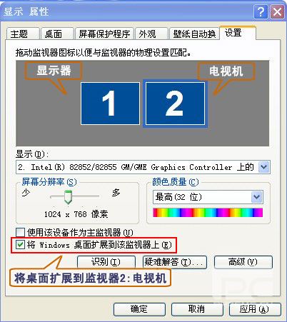 3、選中“桌面2”,然后勾選“將Windows桌面擴展到該監(jiān)視器上”。最后“確定”或“應(yīng)用”,以保存設(shè)置。
