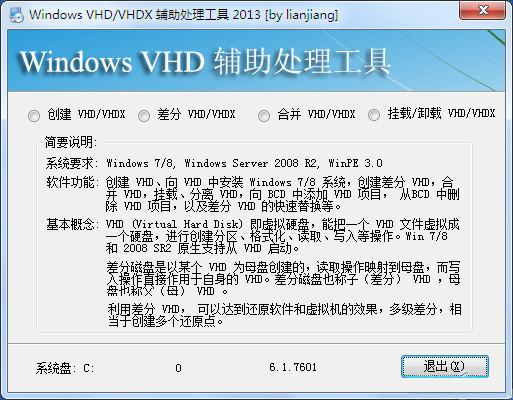 Windows VHD 輔助處理工具是一個用于創(chuàng)建、安裝、維護(hù) VHD 的輔助工具,把一個比較復(fù)雜的操作過程傻瓜化,使您輕松體驗 VHD 的強(qiáng)大功能。包括: 創(chuàng)建 VHD、向 VHD 中安裝 Windows 7 系統(tǒng),創(chuàng)建差分 VHD,合并 VHD,掛載、分離 VHD,向 BCD 中添加 VHD 項目, 從BCD 中刪除 VHD 項目,以及差分 VHD 的快速替換等。內(nèi)置 ImageX.exe 和 Ghost32.exe,支持把 WIM 或者 GHO 系統(tǒng)裝入 VHD。