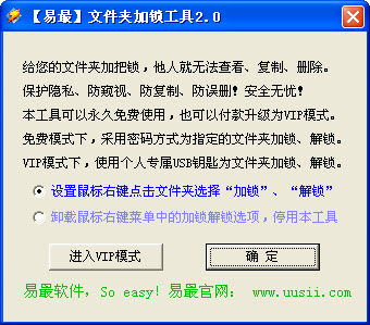 易最文件夾加鎖工具是一款使用非常簡(jiǎn)單方便的文件夾加密工具,適用于一般個(gè)人隱私文件的保密。對(duì)指定文件夾進(jìn)行“加鎖”處理后,他人將無法打開該文件夾、也無法復(fù)制、刪除該文件夾。