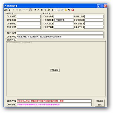 破文生成器是一個可視化的UBB在線編輯工具,它專門用來方便大家編輯破解軟件時的文章,。綠色免費,