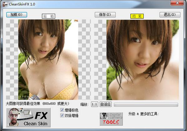 圖片美化小軟件(CleanSkinFX) 1.0綠色中文版 圖片美化小軟件CleanSkinFX是一個(gè)將圖片自動(dòng)美化的小軟件,提供原始圖和結(jié)果圖的對(duì)比,優(yōu)化后的圖片,效果比原來(lái)更加靚麗,具有增強(qiáng)粉色,和雙倍增強(qiáng)的功能。