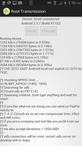 Root交換機(jī)(Root Transmission),用戶可通過此軟件對(duì)自己的手機(jī)對(duì)其他手機(jī)進(jìn)行一鍵Root。作為技術(shù)支撐,Root Transmission軟件需要安裝在一部支持USB OTG功能的Android手機(jī)上,同時(shí)還需要對(duì)應(yīng)手機(jī)的一鍵root腳本文件。在萬事俱備之后,用戶只需點(diǎn)擊應(yīng)用中的Root按鍵,即可實(shí)現(xiàn)對(duì)其他手機(jī)的Root。最后還需要指出的是,目前的Root Transmission還屬于測(cè)試性質(zhì)的版本,所以用起來不是太順手,目前部分機(jī)型(比如必須使用Odin軟件的三星系列機(jī)型)還不能被Root。但是wchill保證稱,至少不會(huì)讓手機(jī)變“磚”。