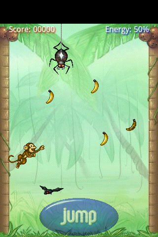 操作簡(jiǎn)單上手!只要控制這只猴子在兩棵樹(shù)之間左右跳躍并遲到香蕉就可得分!不過(guò)要小心不要碰觸到畫(huà)面中間的那些蜘蛛、蝙蝠!游戲的時(shí)候只要按下屏幕下方的JUMP就可以讓這只猴子左右跳躍!