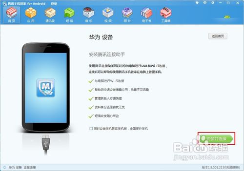 2、安裝完成后,打開”騰訊手機(jī)管家 for Android“程序,根據(jù)界面提示,用USB數(shù)據(jù)線將手機(jī)與電腦連接。
