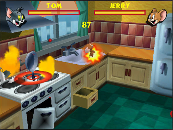 游戲操作很簡單,只有四個操作鍵。和動畫片中不同的是,這回的老鼠不再是一個勁的“逃”了,而是和貓正面相對,一場大戰(zhàn)。像3D格斗游戲一樣,有一個封閉的環(huán)境,剛開始游戲時可選擇“湯姆貓”和“杰瑞鼠”,只要在自已的血槽被打空之前將對方擊倒。