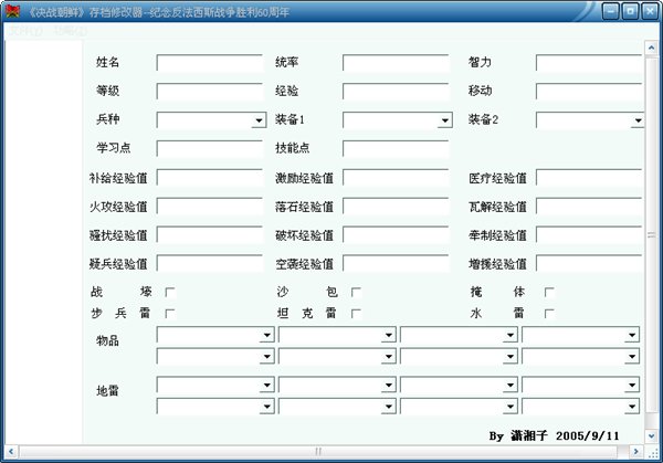 決戰(zhàn)朝鮮人物修改器用來修改決戰(zhàn)朝鮮游戲存檔的工具。決戰(zhàn)朝鮮修改器可以修改存檔人物屬性,技能,裝備,戰(zhàn)術(shù),物品和地雷等。