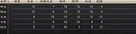 游戲中有槍兵、騎兵、弓兵三種基本兵種和沖車、投石兩種攻城兵器。其中,槍克騎,騎克弓,弓克槍,沖車和投石是攻城器械,只在攻城時能有比較大的發(fā)揮。具體數值見下。