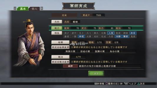 《三國志12》繼承了三國志9代的武將培養(yǎng)系統,武將的能力可培養(yǎng)的有統帥、武力、智力、政治等四維和戰(zhàn)法、秘策。這其中又以后兩者最為重要。