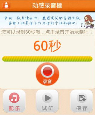 2、動(dòng)感錄音棚:可以錄制一段自唱歌曲、真情告白、節(jié)日祝?;蛐M惑搞笑的音頻片段,再配上優(yōu)美、搞怪的背景音樂,形成一條獨(dú)一無二的彩鈴。