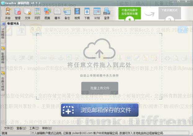 ImapBox郵箱網(wǎng)盤不同于其它的任何云存儲軟件,該軟件本身并不提供給您任何空間。您的存儲空間屬于您在全球任何一個或多個郵箱的空間。您的所有數(shù)據(jù)全部存放于您自已的私人郵箱中。!郵盤(ImapBox)是國內(nèi)專業(yè)的一鍵抓取互聯(lián)網(wǎng)內(nèi)容并永久存儲到郵箱的互聯(lián)網(wǎng)共享軟件。主要提供用戶在互聯(lián)網(wǎng)生活,如工作\娛樂\文案\寫作\閱讀\下載\視聽\交友的過程中,幫助用戶快速永久保存需要長期反復(fù)使用的數(shù)據(jù)。并提供各種便捷的方式供用戶在任意的環(huán)境、平臺、手機里異地使用。