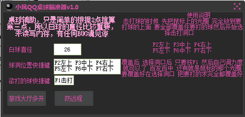 小風(fēng)QQ桌球瞄準(zhǔn)器:只是簡單的根據(jù)2點(diǎn)推算第三點(diǎn),所以白球的直徑比較重要,未讀寫內(nèi)存,有任何BUG請見諒!