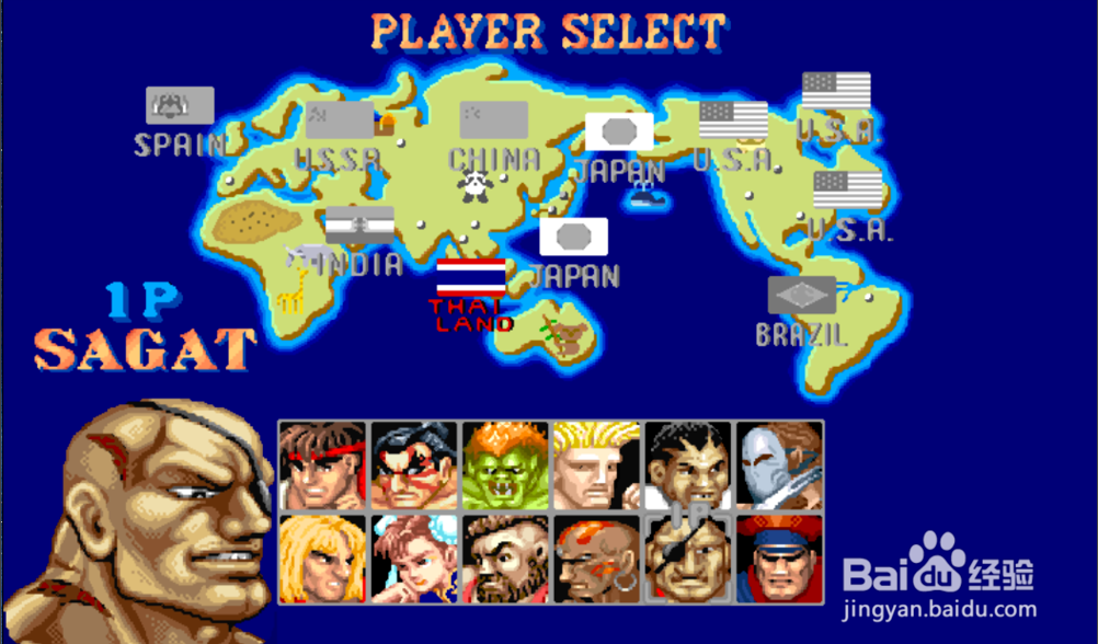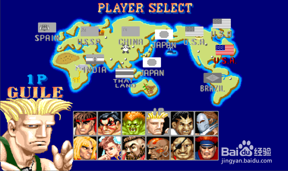 選RYU之后,在GUILE那關(guān)故意輸給計算機,然后投錢繼續(xù)接關(guān)按2P的開始鍵出來,再選RYU,這時,原本應(yīng)