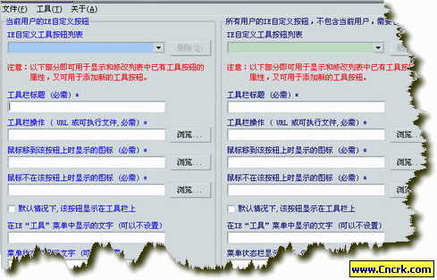 本軟件可方便管理IE自定義工具按鈕,可添加、修改、刪除自定義的IE工具按鈕和菜單,并且可按照需要分別作用于當(dāng)前用戶的IE或所有用戶的IE