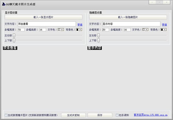 QQ聊天魔術(shù)圖片生成器還可以在圖片上添加文字,并調(diào)整文字位置,一鍵生成并復(fù)制,直接就可以粘貼在聊天窗口中!還可以保存到電腦中!軟件還支持生成新浪微博和騰訊微博魔術(shù)圖片的功能!把魔術(shù)圖片發(fā)到微博中有同樣的效果!