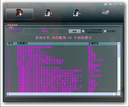 神雕俠侶答題器支持多關鍵字檢索,關鍵字首拼檢索.