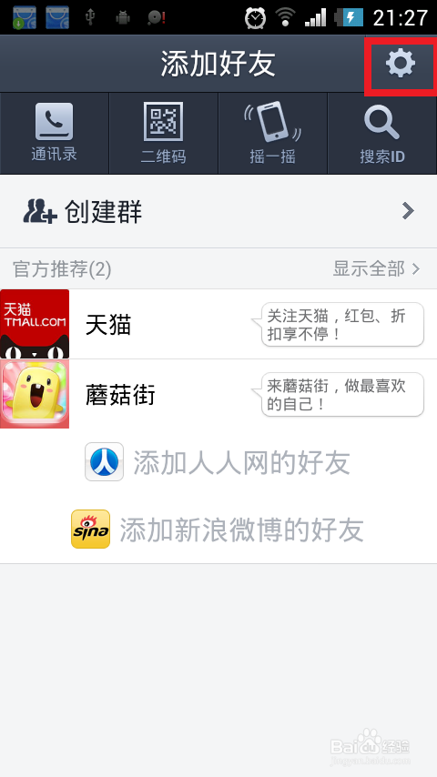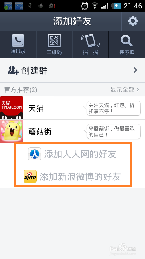 目前l(fā)ine中國已經(jīng)打通人人網(wǎng)和新浪的好友,在添加好友頁面可以直接添加,以新浪微博為例!點擊“添加新浪微博好友”
