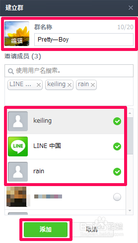 在上方點擊編輯可以設(shè)置line群頭像,然后設(shè)置群名稱,在下方選擇好友加入line群,最后點擊添加就可以了。