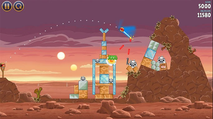 憤怒的小鳥星球大戰(zhàn)版將以著名科幻電影《星球大戰(zhàn)》為背景,比如死星、猛犸機(jī)械人都會(huì)成為游戲場景。各種顏色小鳥和綠豬都能與電影中的角色對上號(hào),黑武士造型的小豬相當(dāng)搞怪。