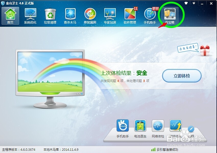 打開金山衛(wèi)士,找到頂部的百寶箱功能。
