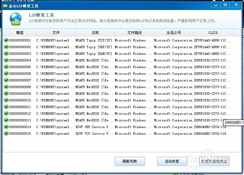 目前大多數(shù)的殺毒軟件或者安全衛(wèi)士都支持修復(fù)LSP功能,比如360,金山,百度殺毒等等。在這里我以金山衛(wèi)士為例,來進(jìn)行LSP修復(fù)。