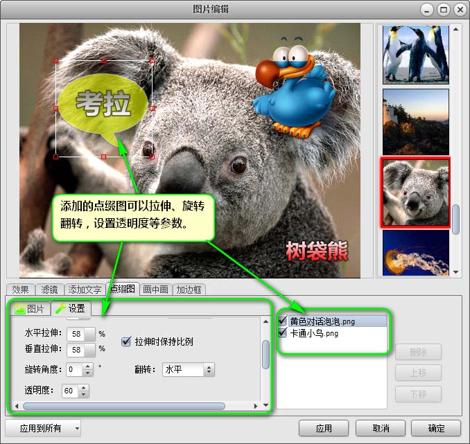 【點(diǎn)綴圖】標(biāo)簽——在“圖片”標(biāo)簽的圖片列表中,點(diǎn)擊一個(gè)圖案可以給當(dāng)前的圖片添加一個(gè)或多個(gè)裝飾圖,通過(guò)鼠標(biāo)拖拽圖片外的框體可以進(jìn)行移動(dòng)和縮放操作,在“設(shè)置”標(biāo)簽中可以設(shè)置當(dāng)前選定的點(diǎn)綴圖的旋轉(zhuǎn)、反轉(zhuǎn)和透明度等參數(shù)。