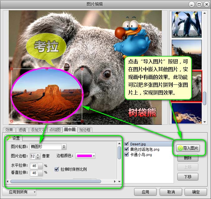 【畫(huà)中畫(huà)】標(biāo)簽——在【畫(huà)中畫(huà)】標(biāo)簽,可以在當(dāng)前的圖片嵌入其他圖片,實(shí)現(xiàn)“畫(huà)中畫(huà)”的效果。點(diǎn)擊右側(cè)的“導(dǎo)入圖片”按鈕,選中要嵌入的圖片即可。通過(guò)鼠標(biāo)拖拽添加的圖片外的框體可以進(jìn)行移動(dòng)和縮放操作。在其中的“設(shè)置”標(biāo)簽中可調(diào)整圖片的輪廓、邊框、透明度等參數(shù)設(shè)置,調(diào)整后可直接看到調(diào)整效果。