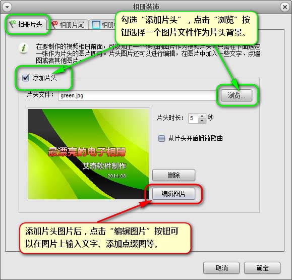 相冊(cè)片頭(片尾)設(shè)置——勾選【添加片頭(片尾)】啟動(dòng)該功能,點(diǎn)擊【瀏覽】按鈕可以選擇一個(gè)圖片做為片頭背景。通過(guò)設(shè)置時(shí)長(zhǎng)可以設(shè)定片頭(片尾)的展示時(shí)間,如果勾選了從片頭開(kāi)始播放音樂(lè),那相冊(cè)如果添加了音樂(lè)文件會(huì)從片頭就開(kāi)始播放,如果不勾選,會(huì)在展示完片頭后,進(jìn)入“正片”階段再播放音樂(lè)。點(diǎn)擊【編輯圖片】進(jìn)入圖片編輯界面,可以對(duì)片頭背景圖片添加文字、裝飾圖、邊框等操作。