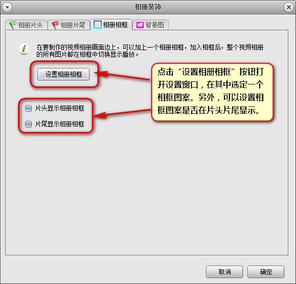 相冊(cè)相框設(shè)置——在此設(shè)置的這個(gè)相框是針整個(gè)相冊(cè)視頻加的外框裝飾。貫穿除片頭片尾之外的所有電子相冊(cè)展示內(nèi)容。