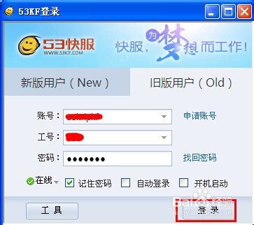 設(shè)置53客服常用語的方法一1.首先點擊并打開53客服軟件,小編操作的是老版的登陸,接著輸入賬號,工號和密碼,然后點擊登陸。(如下圖)