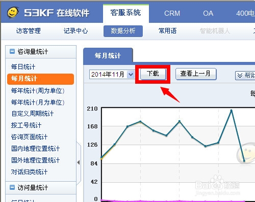 4.在數(shù)據(jù)分析頁面,選擇相應(yīng)的統(tǒng)計數(shù)據(jù),比如每月的統(tǒng)計,在中間選擇相應(yīng)的統(tǒng)計月份,然后再點擊“下載”按鈕。(如下圖)