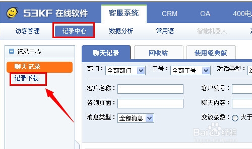 3.來到53客服系統(tǒng)設(shè)置頁面中的記錄中心,想要查看和下載統(tǒng)計數(shù)據(jù)的話,需要點擊記錄中心右邊的“數(shù)據(jù)分析”菜單。(如下圖)