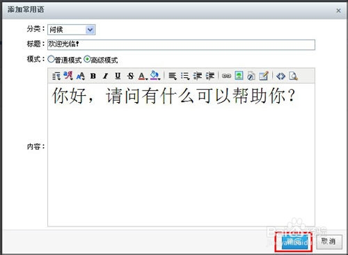 4.然后開始常用語的編輯,選好分類和寫好標題之后,可以選擇高級模式進行內(nèi)容編輯,可以進行字體的選擇,大小調(diào)整,顏色設(shè)置、圖片導入和打開相應(yīng)的鏈接等等,可以根據(jù)自己的情況進行相應(yīng)的設(shè)置。
