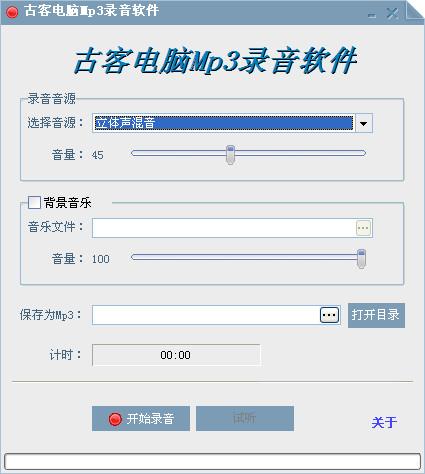 古客電腦Mp3錄音軟件 V2.1 免費(fèi)下載 古客電腦Mp3錄音軟件是完全免費(fèi)的錄音軟件,無錄音時(shí)間限制,自動(dòng)保存為Mp3文件,無需再次壓縮??烧{(diào)節(jié)錄音音量,如麥克風(fēng)話筒音量等。支持同時(shí)錄制背景音樂,用它來錄制自己的卡拉OK、翻唱歌曲非常方便。