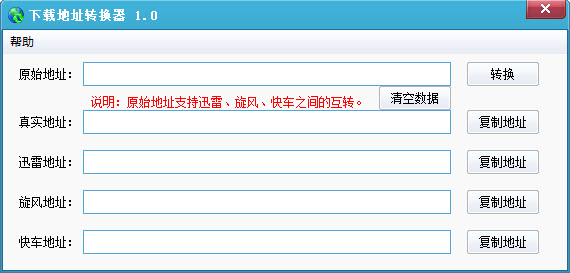 至尊潮流下載地址轉(zhuǎn)換器:可以方便的轉(zhuǎn)換下載地址,目前支持迅雷、旋風(fēng)、快傳互轉(zhuǎn)。小白作品,高手勿噴。PS:易語言編寫的殺軟可能會(huì)誤報(bào),請無視。不放心可以沙盤中使用。
