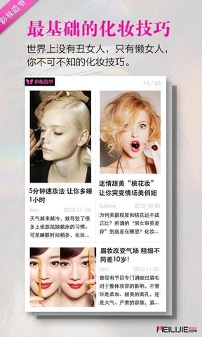 彩妝造型是一款專門為女性朋友們打造的化妝類應(yīng)用,彩妝造型介紹最實(shí)用有效的彩妝技巧,了解最新流行的彩妝資訊,讓你們每一天都能夠擁有一個(gè)漂漂亮亮的裝扮。
