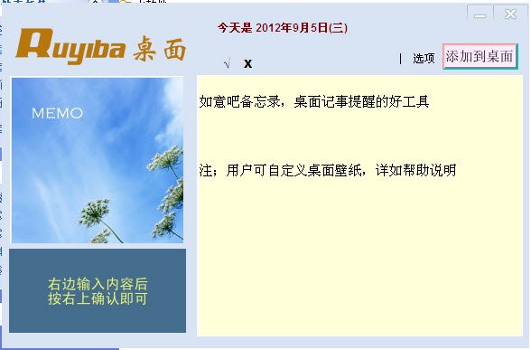 桌面?zhèn)渫?/strong>適合于經(jīng)常忘做一些要做的事情,結(jié)果經(jīng)常挨領(lǐng)導(dǎo)訓(xùn)的人。如意吧桌面?zhèn)渫泴?chuàng)意,想法及每天工作事項(xiàng)添加到桌面輕松提醒,可加入打鉤打叉,標(biāo)注事件是否完成?方便隨時(shí)修改內(nèi)容更新至桌面,簡(jiǎn)單操作不占用電腦資源及內(nèi)存。