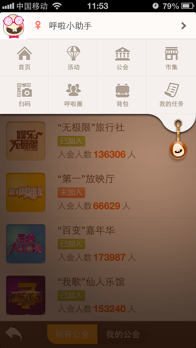 除了在社交功能上的革新和飛躍,呼啦II在導(dǎo)航、公會(huì)、活動(dòng)、獎(jiǎng)勵(lì)等模塊、功能以及操作方式上都做了極大的改動(dòng)和升級(jí)。首先,對(duì)用戶首頁(yè)進(jìn)行了重新設(shè)計(jì),采用扁平化的框架結(jié)構(gòu),3D式的界面設(shè)計(jì)、動(dòng)態(tài)的呼啦形象和表情貼圖給用戶極致的視覺(jué)體驗(yàn),更加符合情景互動(dòng)游戲的特征。呼啦II還引入了一個(gè)“全局導(dǎo)航鍵”,解決軟件功能較多時(shí)用戶需要多次操作才能進(jìn)行板塊切換的體驗(yàn),提高了App的易用性。