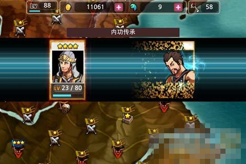 升級就很簡單了。找個關(guān)卡。就是攻城門的那一種。你不用管后面的投石車。一路滾過去。就是輕擊屏幕兩下。然后到終點了放個赤兔馬之翼。打兩下。過關(guān)了。然后就是加3分之一的經(jīng)驗。