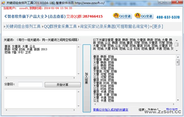 關(guān)鍵詞組合排列工具 免費(fèi)版 關(guān)鍵詞組合排列工具是智者軟件推出的首款算法類(lèi)工具,適用于各類(lèi)關(guān)鍵詞組合優(yōu)化,直通車(chē)關(guān)鍵詞組合優(yōu)化、網(wǎng)站長(zhǎng)尾關(guān)鍵詞組合優(yōu)化等!可輸入多組關(guān)鍵詞(每組可輸入多個(gè)關(guān)鍵詞)自動(dòng)生成組合新的詞組,自動(dòng)過(guò)濾重復(fù)!支持歷史記錄保存和導(dǎo)出功能!