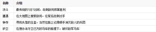 兩人進行對戰(zhàn),對戰(zhàn)類型分為四種,分別是“決斗”、“遭遇”、“爭奪”和“護衛(wèi)”。
