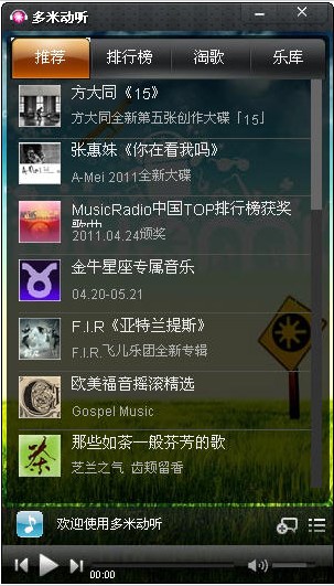 多米動(dòng)聽 V1.0綠色版 多米動(dòng)聽和多米音樂不同,該軟件主要是向你推歌,而多米音樂主要還是搜歌。當(dāng)你不知道要聽什么歌時(shí),可以試試這個(gè)軟件,多米熱歌推薦、多米排行榜,幫你找到時(shí)下最流行的歌曲,讓聽音樂變得如此簡單。