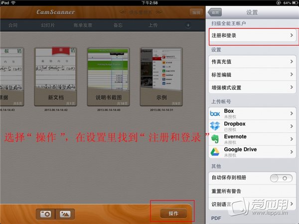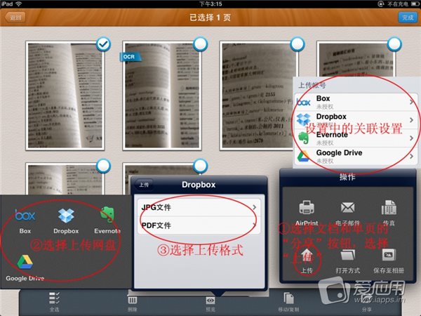 選擇“操作”,選擇“設(shè)置”,設(shè)置菜單下有一欄“上傳賬號”,其中包括 Box,Dropbox ,Evernote ,Google Drive 四個選項(xiàng),你可以在這里進(jìn)行綁和取消綁定,以 Dropbox 為例,選擇它,在彈出的窗口中輸入登錄信息。允許授權(quán)。完成綁定。之后你可以進(jìn)入文檔查看頁面,在完整的文檔或者單頁圖片查看中,選擇“分享”按鈕,再選擇上傳,選擇上傳的格式(JPG 或 PDF),再選擇上傳到的文件夾,最后選擇“立即上傳”。等待上傳完成!